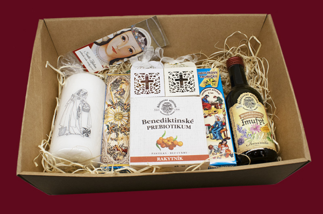 Dárkový balíček je zabalen do celofánové folie s mašlí.