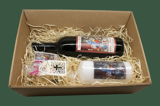 Dárkový balíček je zabalen do celofánové folie s mašlí.